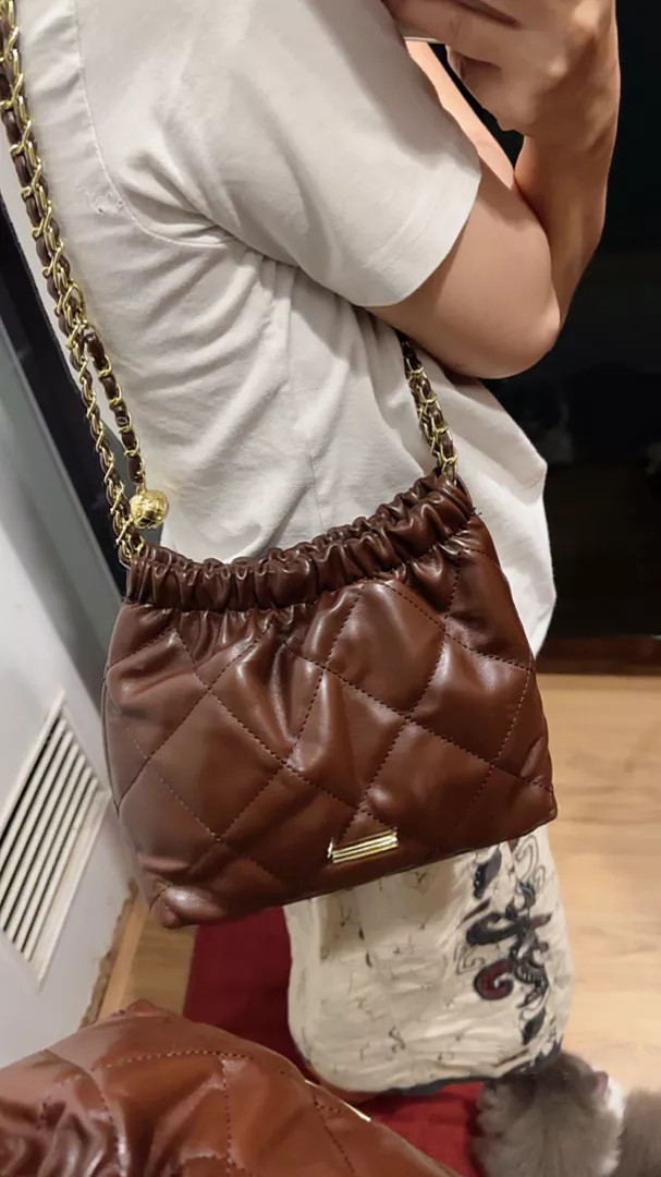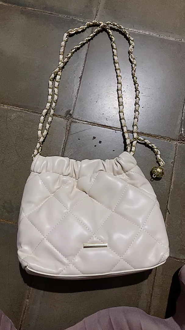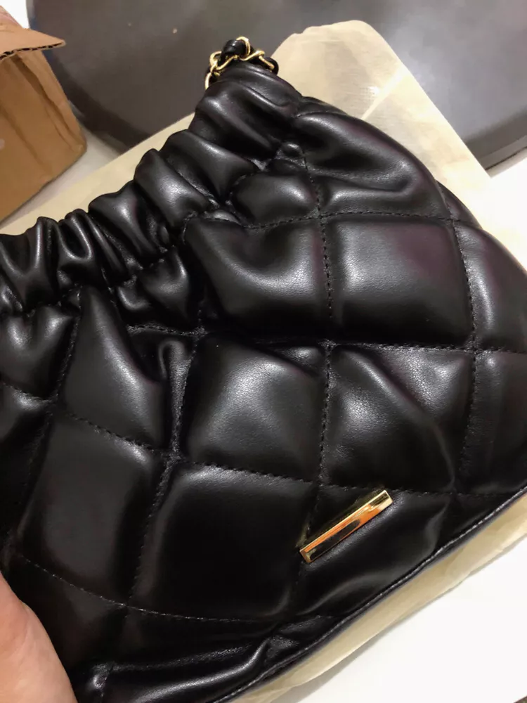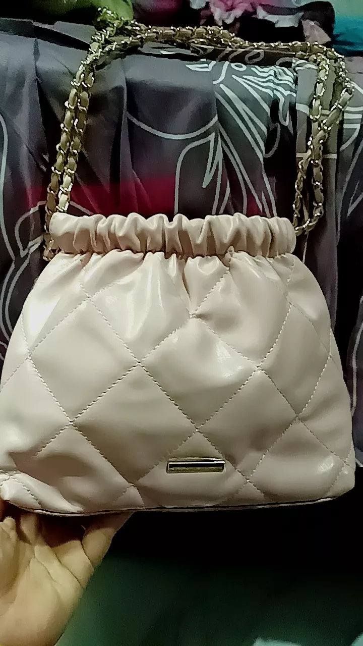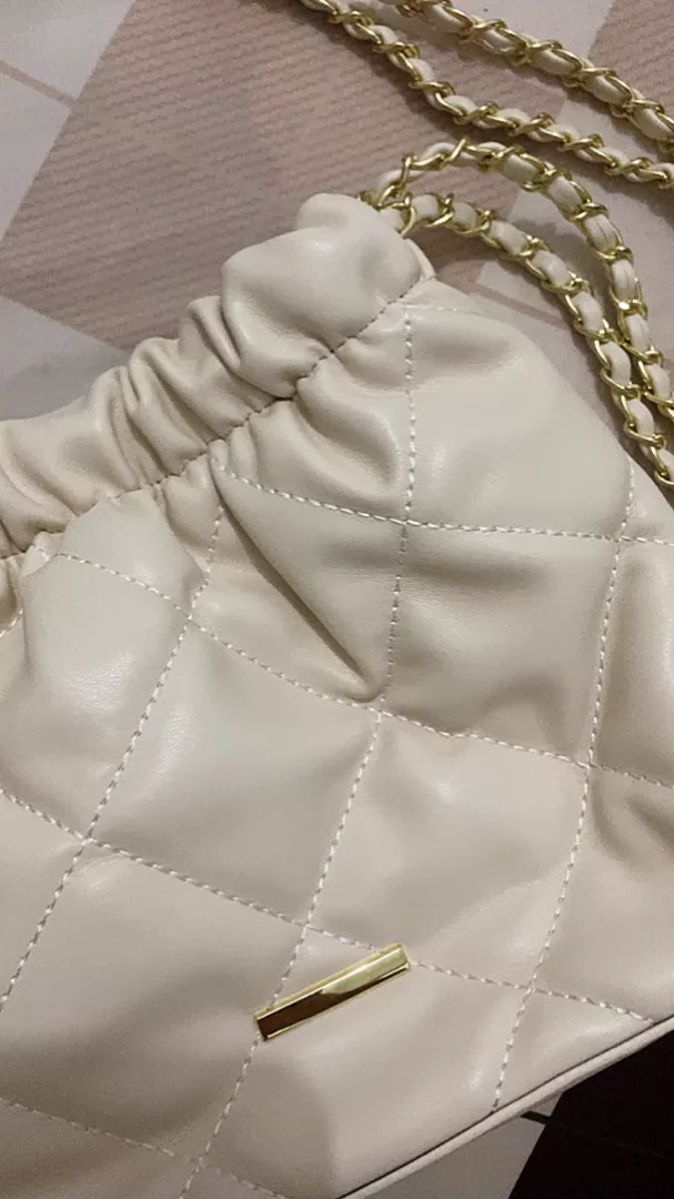 Dilengkapi juga dengan tali rantai yang memberikan kesan lebih mewah. Desain tas serut wanita ini sangat praktis untuk membawa barang-barang kecil Anda.